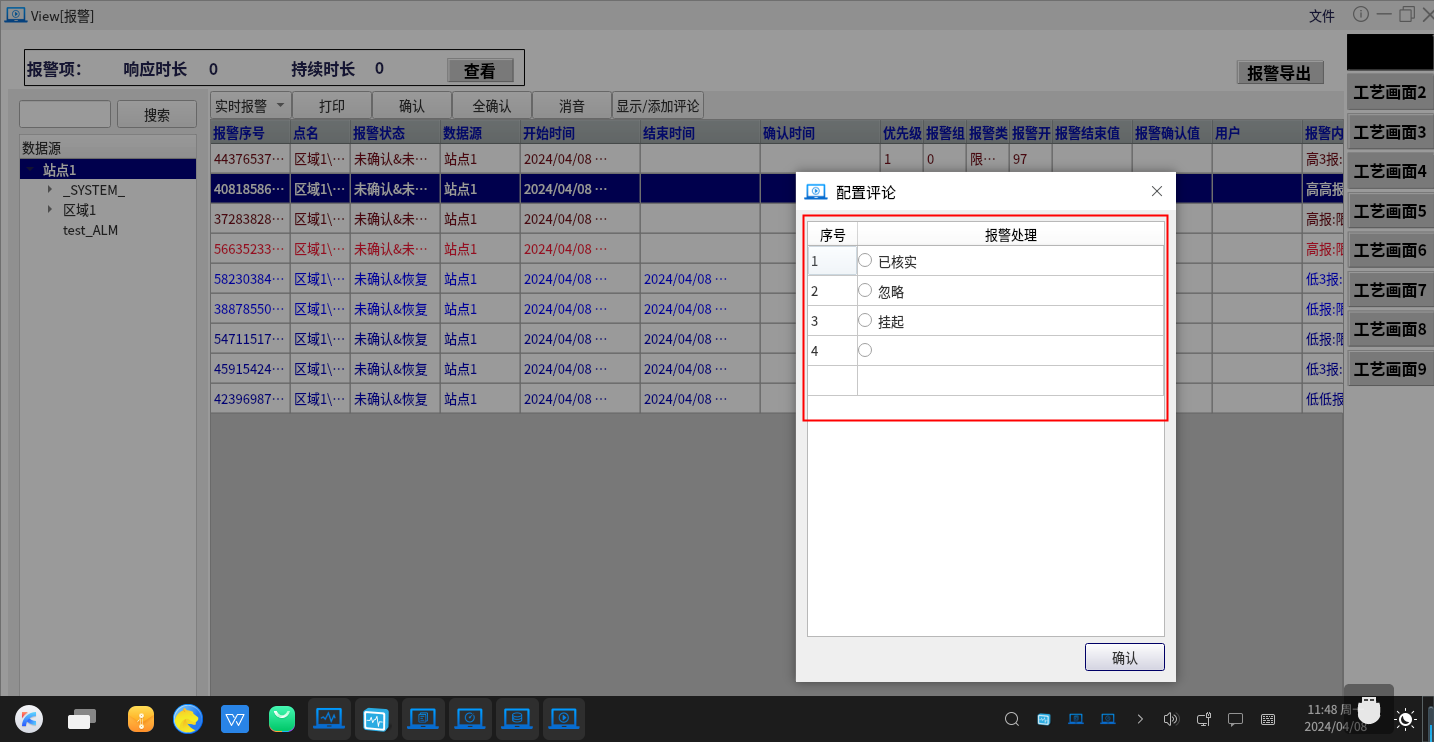 报警处理,根据报警信息字段内容,依据工艺设备情况,报警处理时做评论标注,便于问题或原因追踪。