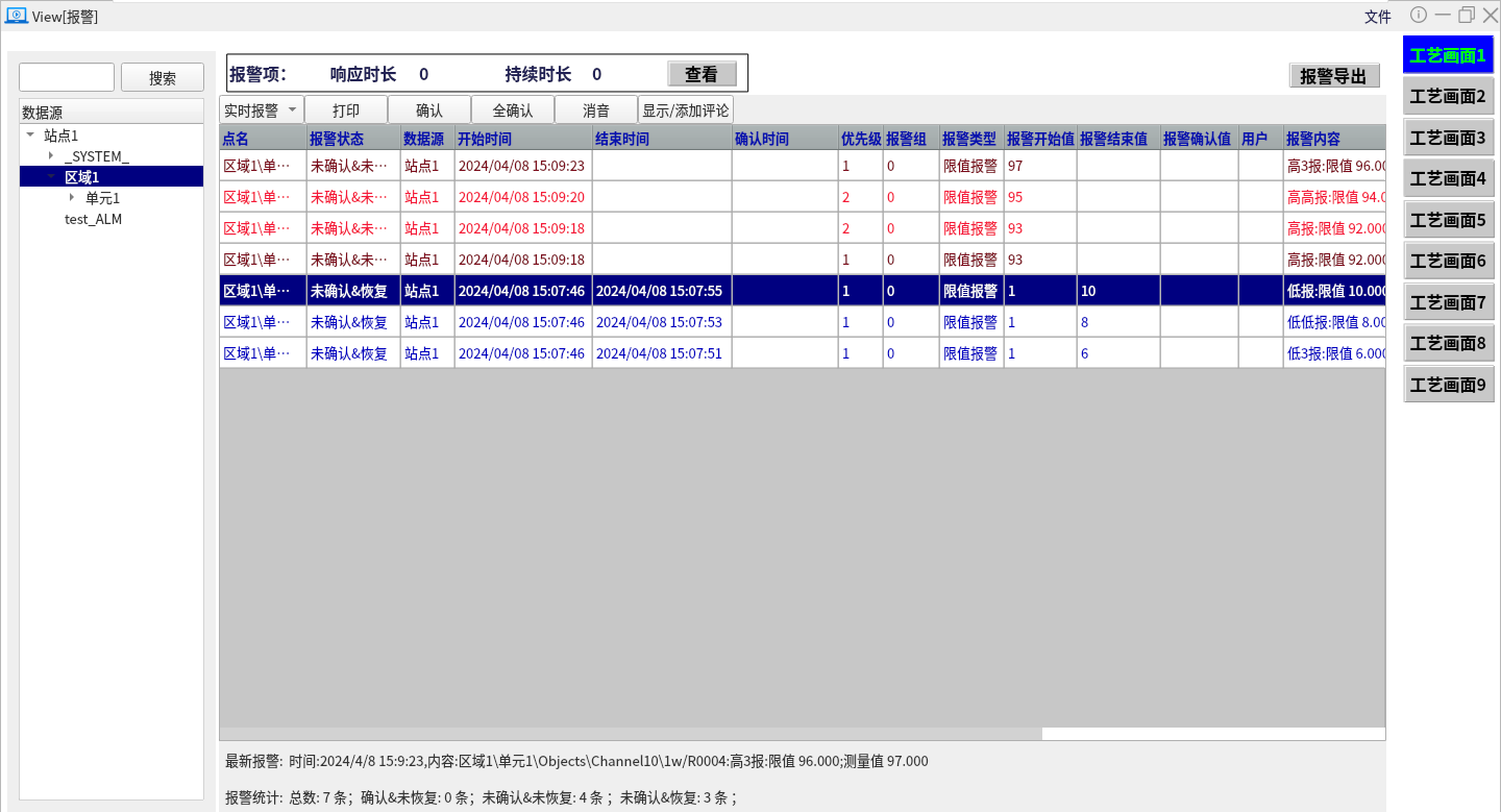 报警对应工艺画面及设备位置的快速精准定位,报警发生时,直接定位到对应工艺画面,或通过数据源树定位至区域、车间或专业节点下做对应报警筛查。
