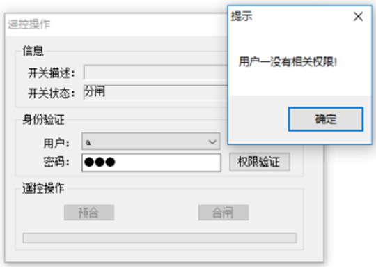 3. 完成遥控组态进入运行界面,点击遥控组件,输入有遥控权限的用户名及密码(若组态时选择双席校验,则需要输入两次),开始遥控,若用户不具备控制权限,弹出提示;