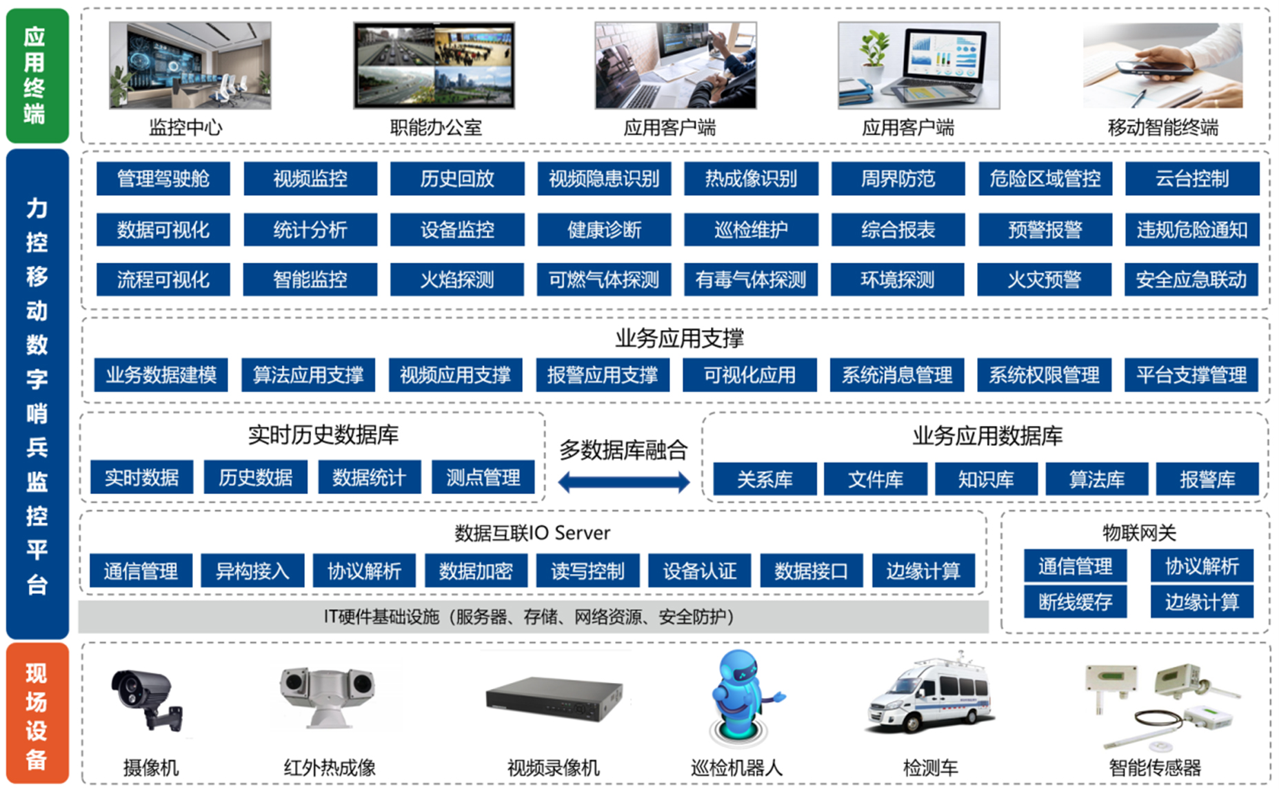 力控移动数字哨兵监控平台支持探测装置、智能传感器、视频图像、安防报警以及各类工业设备统一接入管理,实现各维度数据统一展示分析,并结合算法模型实现AI识别、危险提醒、数据分析、预警等智能应用, 提高现场安全防范、智能运维能力,该平台目前已广泛应用于石油、化工、矿山、楼宇、变配电、交通、环保等领域。