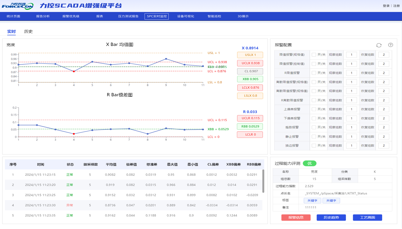 力SCADA质量管理是专业的质量过程管控工具,产品基于SCADA实时生产过程数据,生成各类控制图表,对来料、半成品、成品等实现全面质量监控,及时发现生产过程异常,实时推送异常数据,提供失控标注处理机制,持续优化质量,对传统SCADA的质量功能进行扩展与增强,实现质量管理透明化、科学化,帮助企业不断提升质量管理水平。