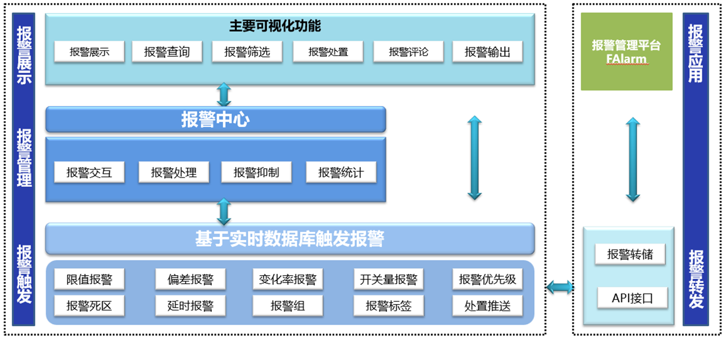 通过数据库配置执行、后台处理、前端展示的模式确保报警触发的实时性。报警多级别、多类型、多结构,以及多客户端显示/确认的设计便于客户高效处理和筛选报警信息。