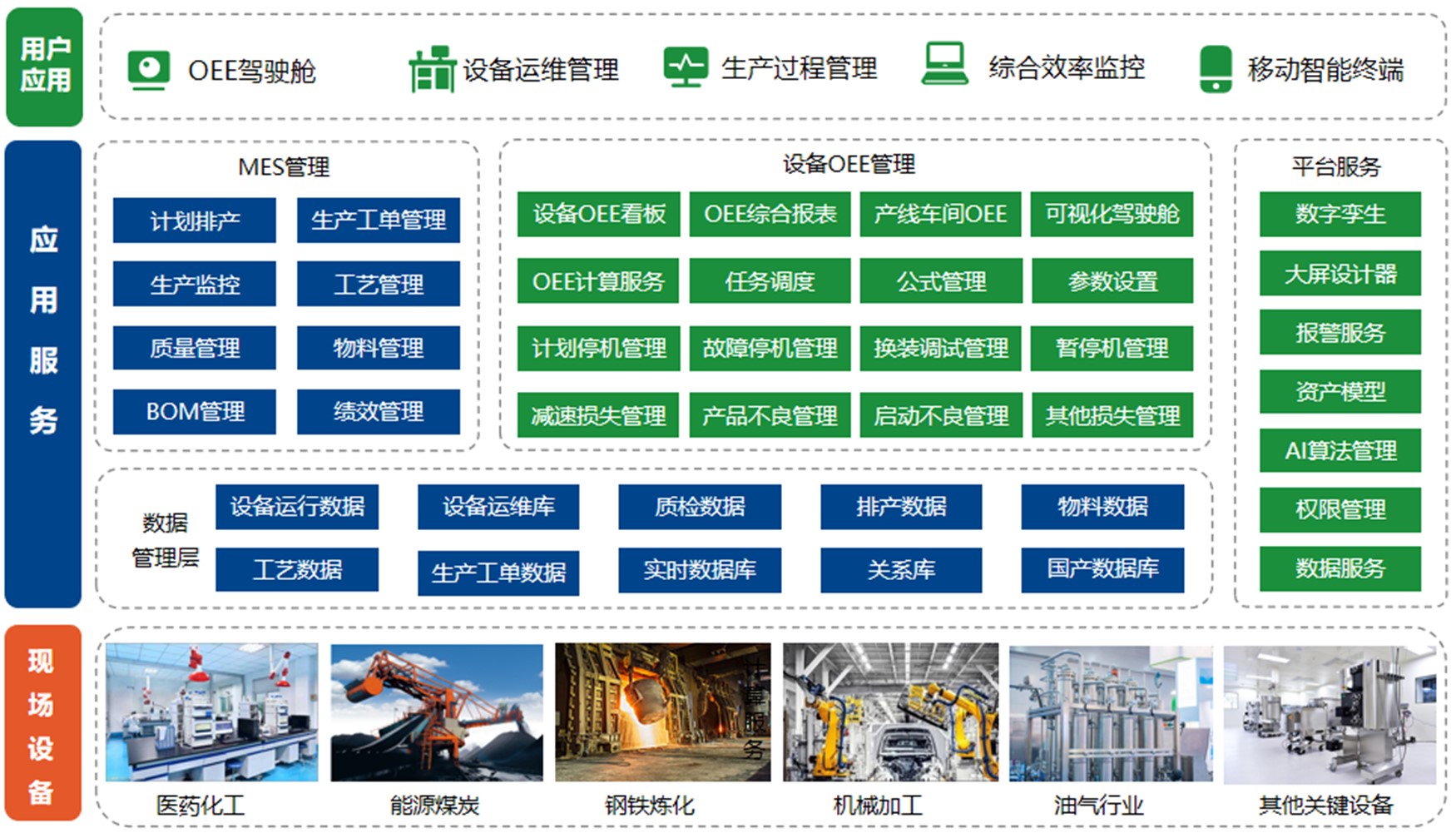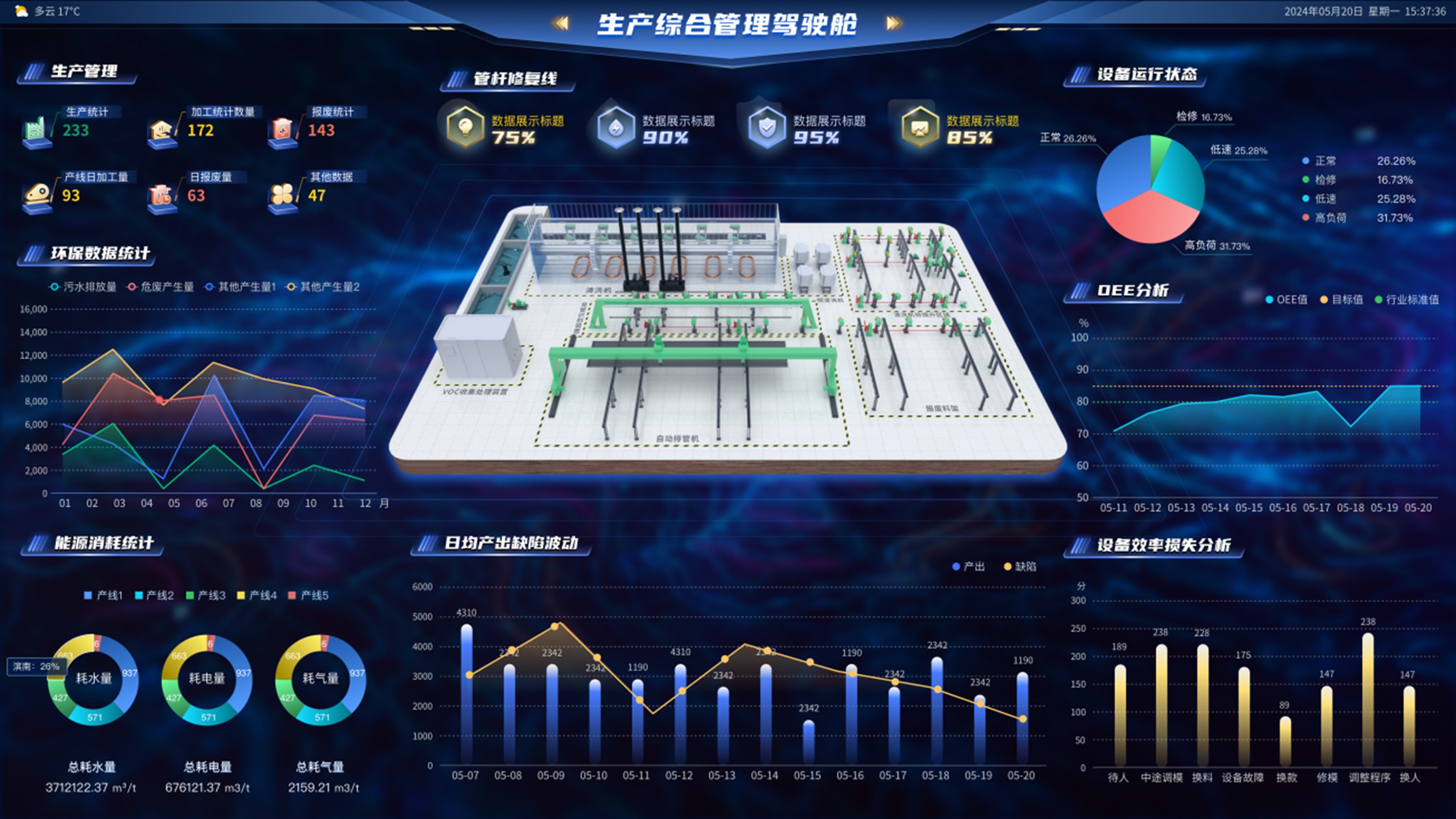 OEE计算服务能够实现可用性、性能和质量指标的综合计算,形成覆盖设备、生产线、车间等多层级的OEE综合分析,运用大屏可视化、报表和数字孪生等手段实现数据可视化展示。