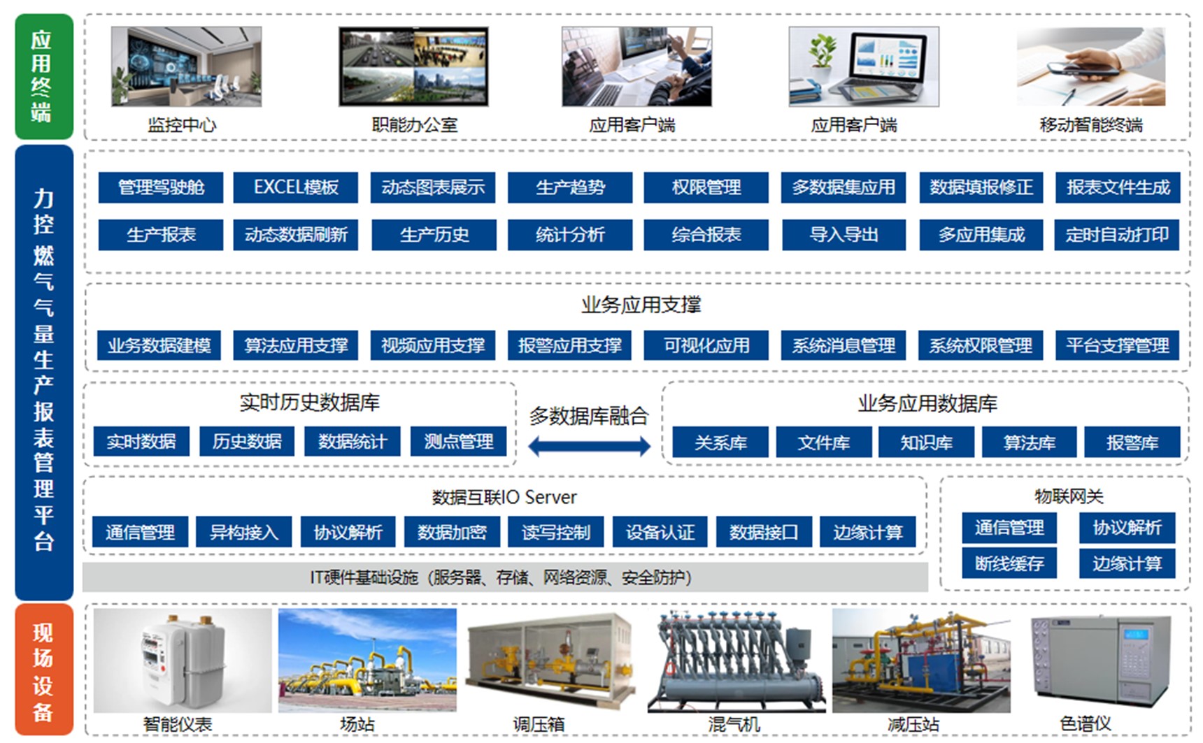 基于力控燃气气量生产报表管理平台、企业实时历史数据库pSpace形成解决方案,功能包括资产模型的建立,场站设备台账生成,设备运行监控及报警处理、核查管理、智能报表等,实现天然气气质数据全面采集、存储以及相关业务处理和报表统计分析。