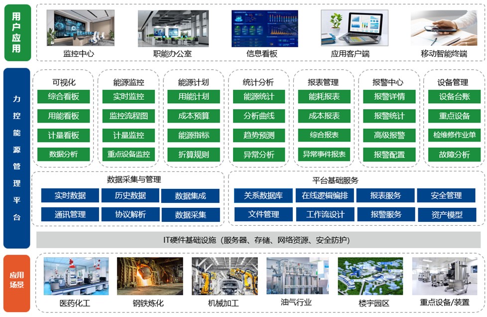 力控能源管理平台,致力于赋能企业节能增效、能源管理转型,通过结合工业大数据技术,为建筑、工业园区、高耗能企业提供能源管控一体化解决方案,从能源的采购、转化、输送及消耗等全过程,实现实时数据采集、监控、统计分析,保证供配水、电、气等资源的集中管理与调度。