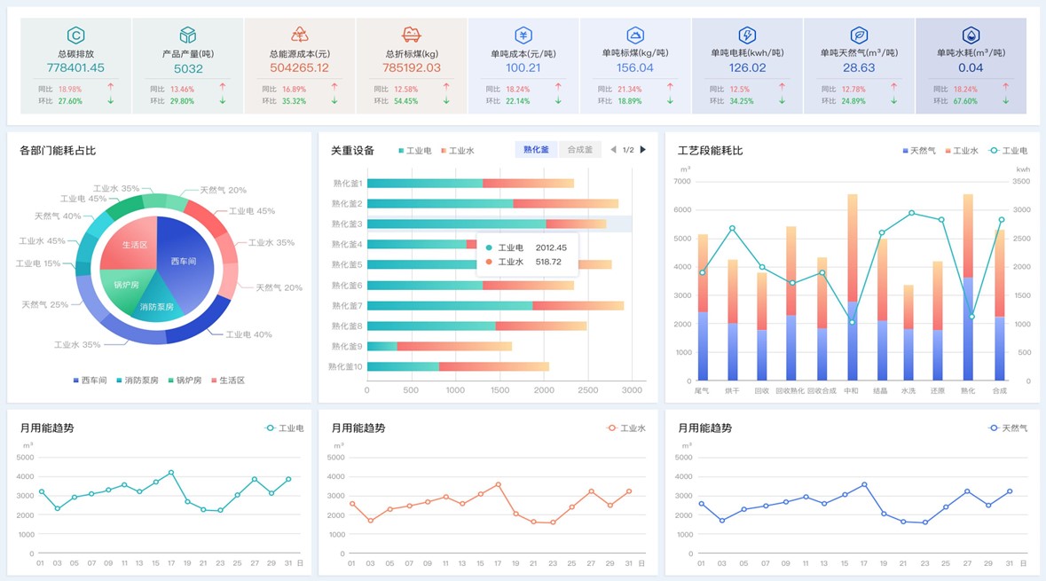 平台结合用能指标、报警策略,实现能耗超标智能报警。根据能耗实时监测、变化趋势、产量、生产计划,预测企业用能负荷、未来消耗量。结合折标系数、碳排放系数,实现标准煤转换、碳中和管理。