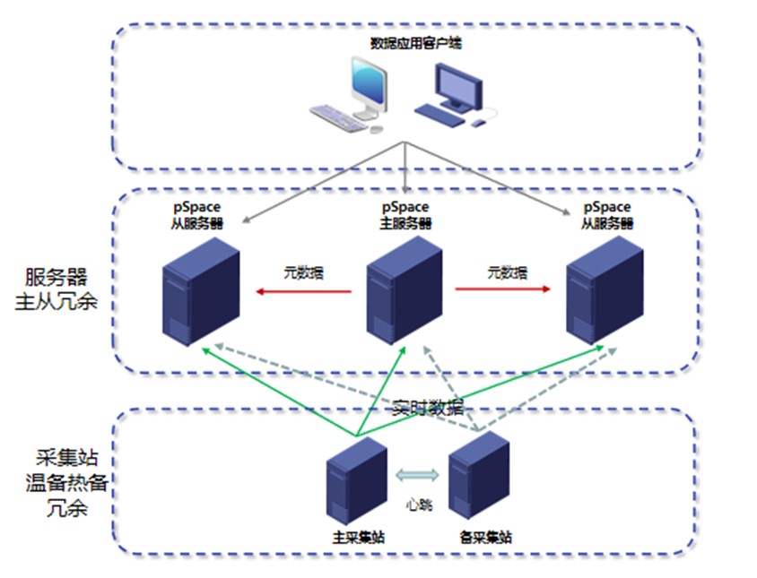 主从冗余:主服务器的元数据主动同步到从服务器,保证主从服务器工程一致性;实时数据都来自采集站,保证实时数据一致性;断线缓存功能确保数据的完整性;采集站冗余保证采集数据不丢失。