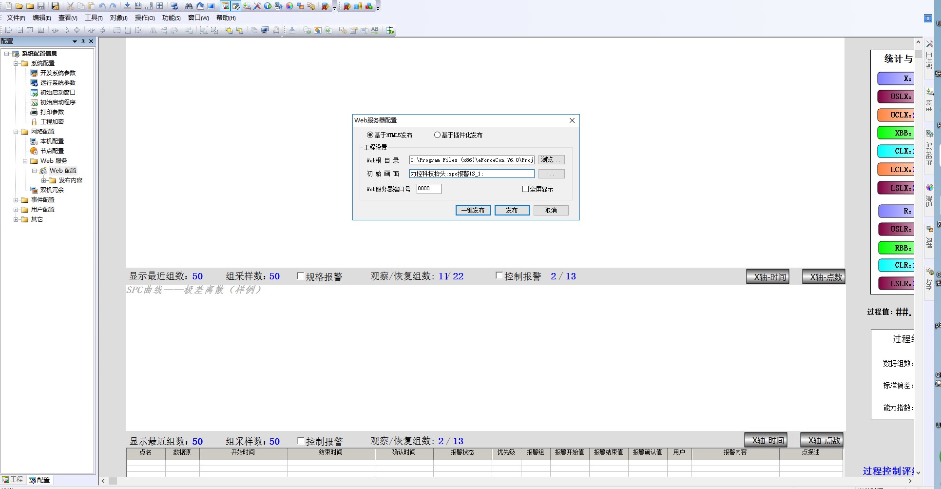 力控SCADA平台SPC的预警与报警集成了多项功能,包含X-bar与R-bar的限值、偏单、趋势、静止等,以及对应观察与恢复组数的报警触发机制,可在问题显现时通过声光警报及时提醒,自动发送邮件通知相关人员。一旦发现失控,可迅速查明原因并纠正,达到质量与工艺持续改进的目的。