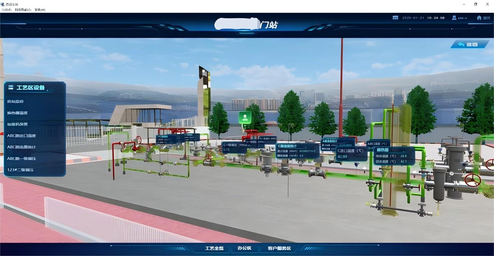 用户可根据实际厂区布局、设备尺寸与空间关系,自主搭建高保真 3D 模型。结合监控数据,对模型进行移动、旋转、缩放等交互操作,并通过动画效果模拟物料流动、设备启停、阀门开闭等过程,实现工艺流程的动态化、多维度可视化展示,大幅提升监控直观性与信息获取效率。